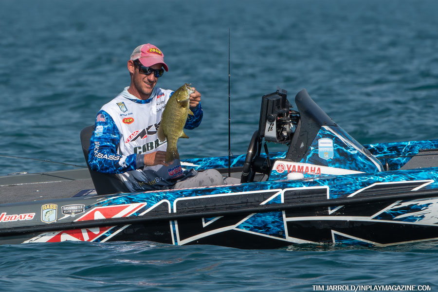 Illinois pro Trey McKinney continued his smallmouth mastery on Day 2, bringing in an impressive 23-pound, 10-ounce limit to maintain his tournament lead with a two-day total of 48 pounds, 5 ounces. McKinney’s bag was anchored by a beautiful 5-pound, 8-ounce smallmouth. The 20-year-old phenom has been playing country music on the water to calm his nerves, a strategy that seems to be working well as he’s also taken control of the Progressive Bassmaster Angler of the Year race.