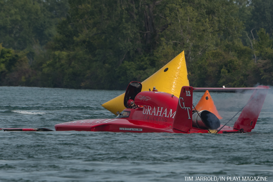 FINAL HEAT: The Final Heat was marred by a collision (see photos) between Bert Henderson and J. Michael Kelly in the run out of the Roostertail Turn toward the start. Henderson bounced off of Jimmy Shane to his right, spinning to his left into the path of Kelly, who ran over the top of the U-7. Niether Henderson or Kelly were hurt in the incident. The U-12 crew scrambled to repair their boat for the restart, which they made with time to spare. In the restart, Shane led the field wire to wire, with Tate in second and Jimmy King in third. Kelly lost another canard front running through Tate’s wake and had a fuel violation, earning a DSQ.