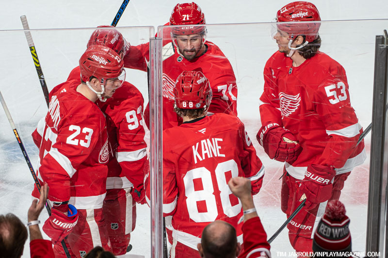 - 5:06 – Patrick Kane (13) extended the lead to 3-0 with another power-play goal, assisted by Moritz Seider (30) and Lucas Raymond (41).