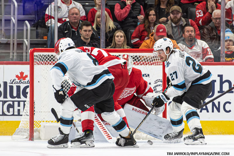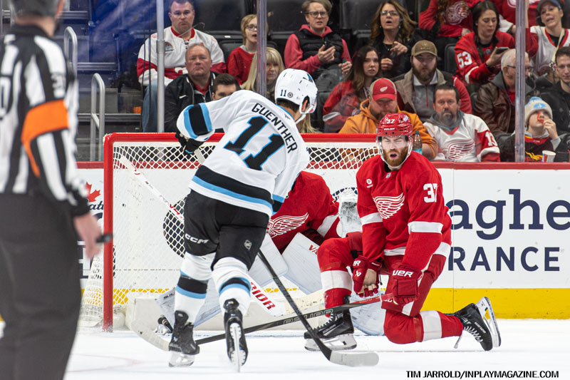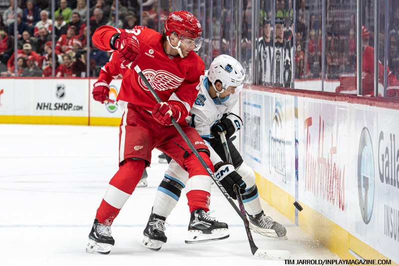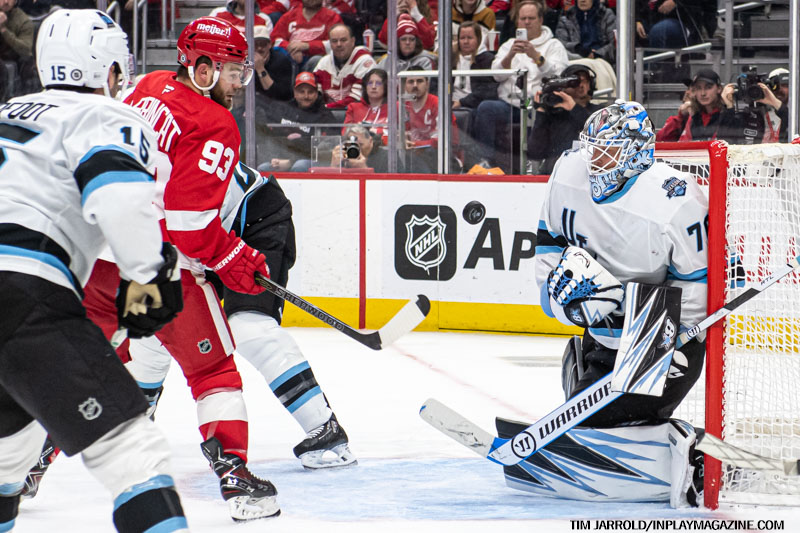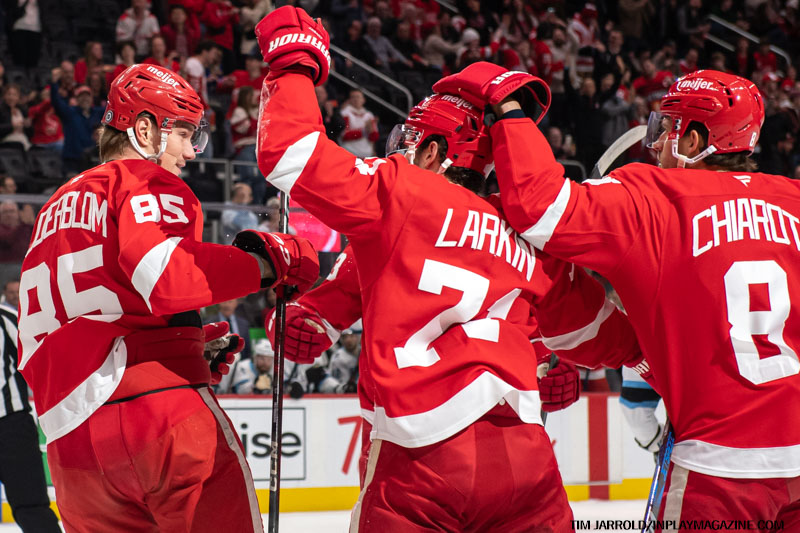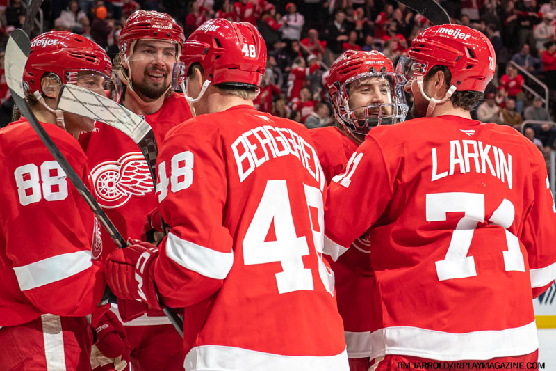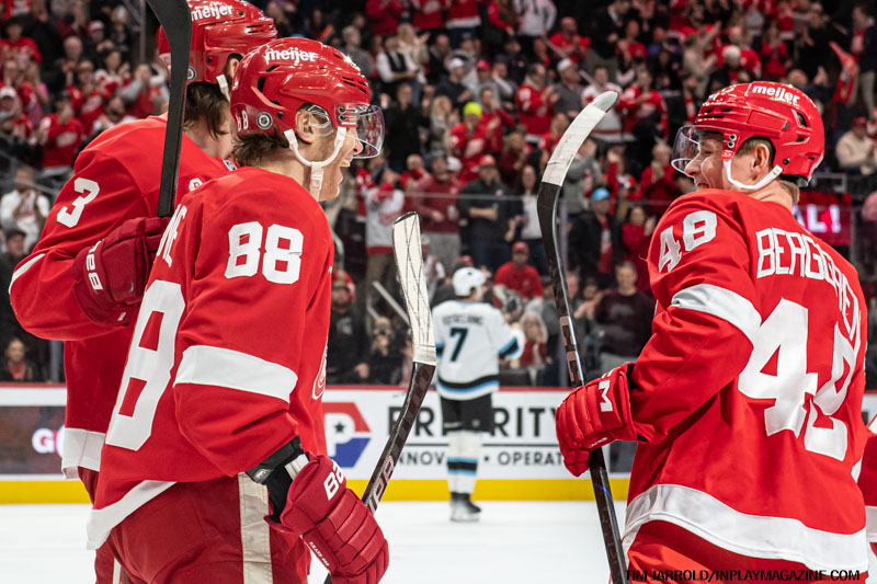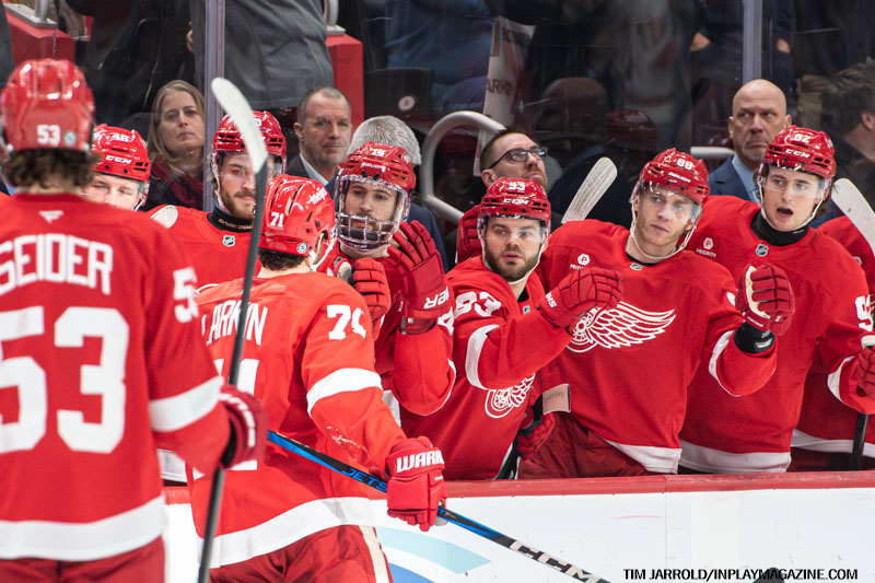 - 8:49 – The Red Wings took the lead with Jonatan Berggren scoring his 10th goal, assisted by Tyler Motte (3) and Patrick Kane (24).
