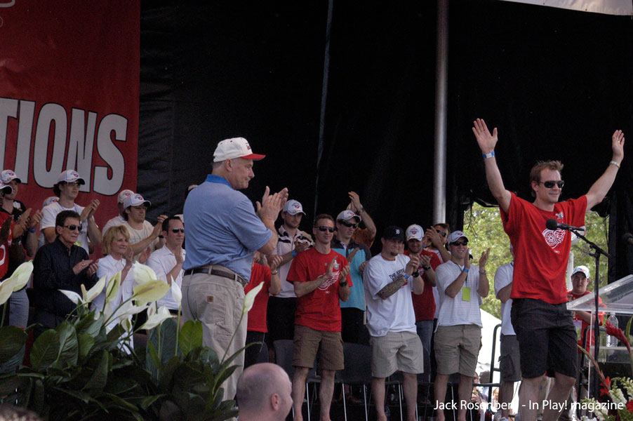 Feature photo Ken Holland, Mike Ilitch, Marion Ilitch, Gordie Howe and Nick Lidstrom cut the red ribbon at the Gordie Howe entrance. Photo by Jack Rosenberg – In Play! magazine