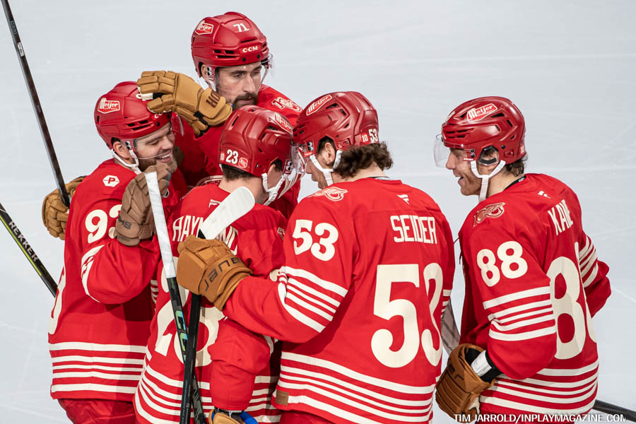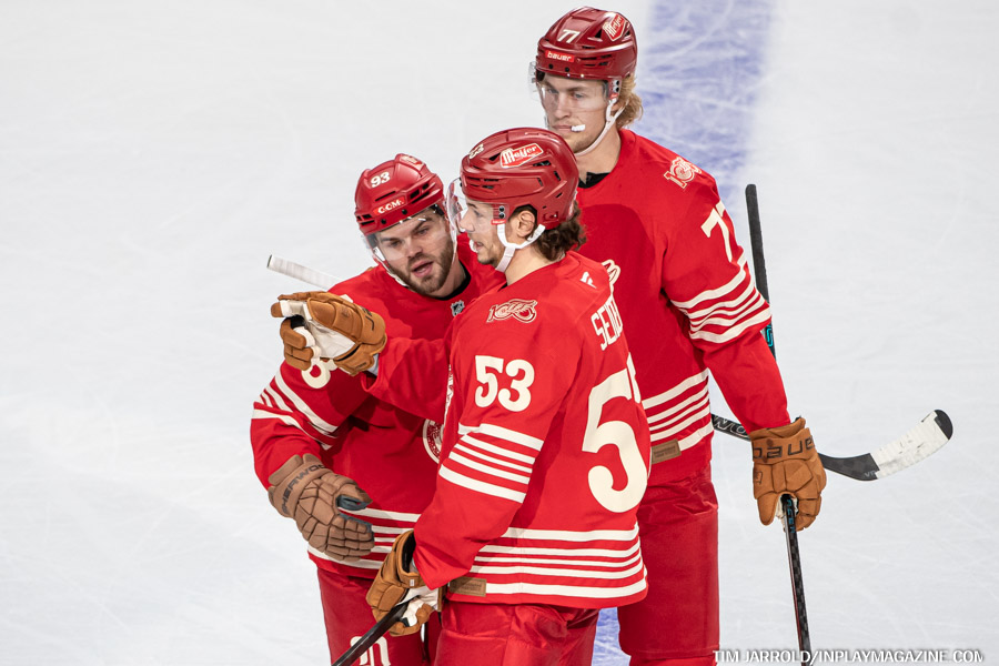 Moritz Seider was the game’s first star with a three-point night (1 goal, 2 assists), showing why he’s becoming one of the league’s elite defensemen. Alex DeBrincat earned second-star honors with a goal and assist, while Boston’s Alex Steeves claimed the third star with his two-goal performance.