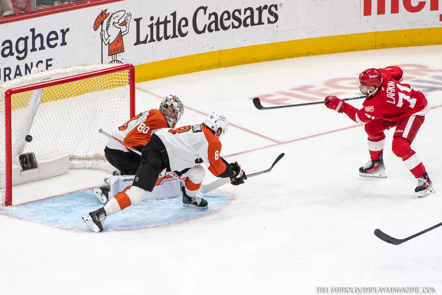 Philadelphia attempted a comeback with their own 5-on-3 advantage. However, Larkin extinguished those hopes by scoring a spectacular short-handed breakaway goal at 4:56 of the second period. This momentum-crushing goal forced the Flyers to replace Vladar with Samuel Ersson.