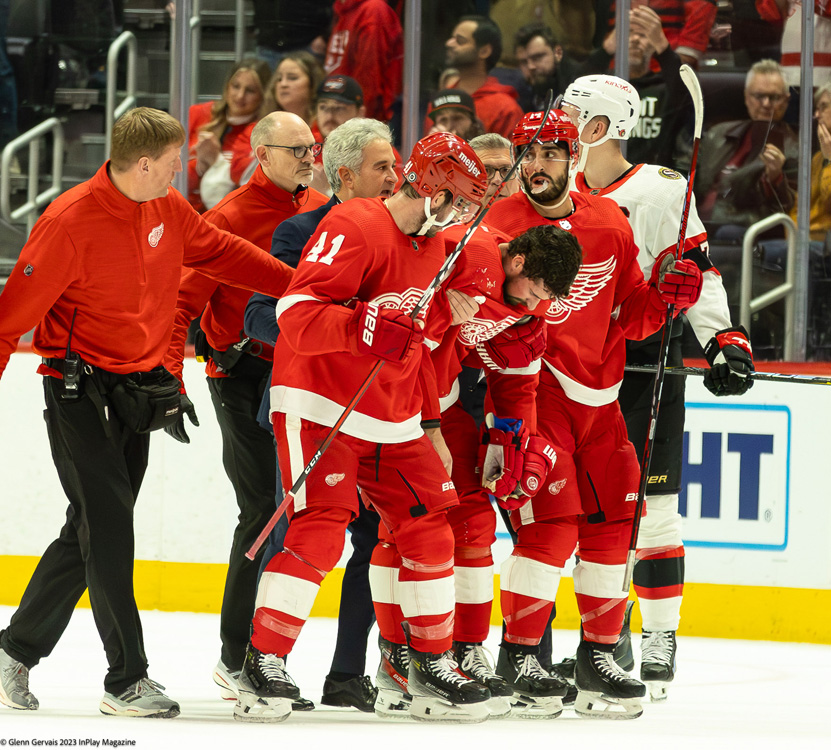 The incident with Larkin left the Red Wings short-handed. With Perron’s ejection and Larkin’s injury, they were left with only nine forwards.