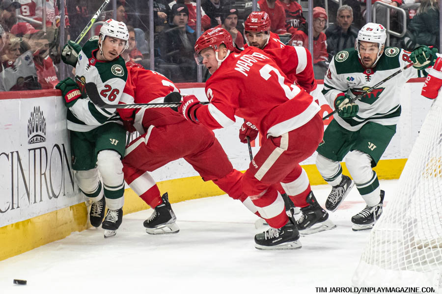 The second period saw a scuffle in front of the Red Wings’ goal, resulting in coincidental unsportsmanlike conduct minors for Moritz Seider of the Red Wings and Marco Rossi of the Wild.