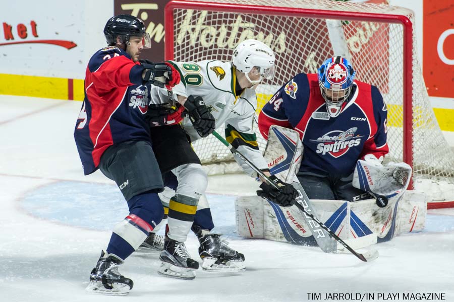 Michael DiPietro made 15 saves as the Windsor Spitfires defeated the London Knights 3-1 at the WFCU Centre Tuesday night. The win gives Windsor a 2-1 lead in their Ontario Hockey League Western Conference quarter-final play-off series. Read John Humphrey’s complete game recap HERE.